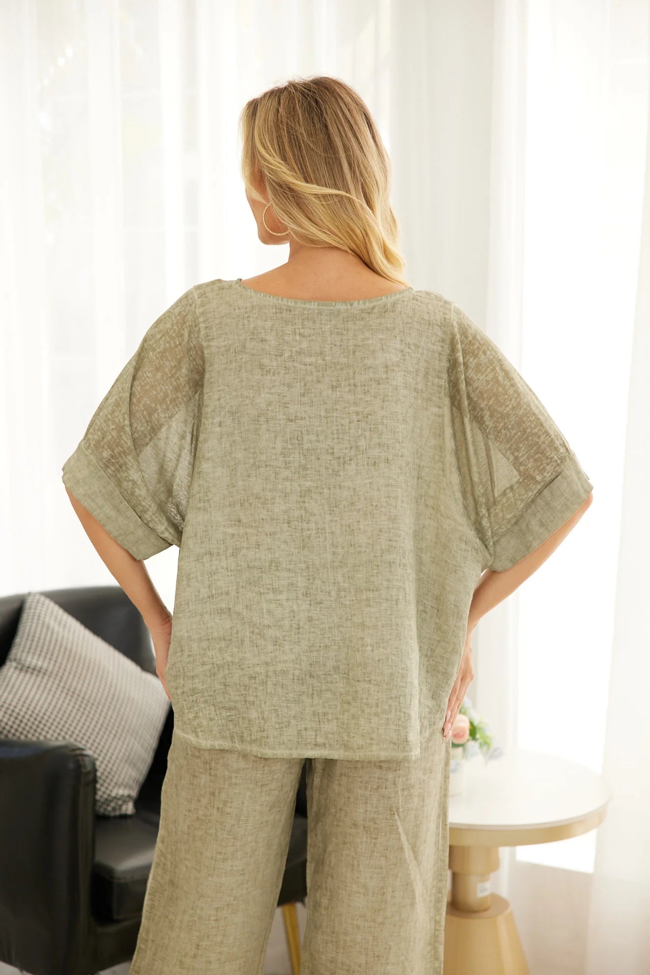 Cold Wash Linen & Cotton Knit Sleeve Round Top in Military