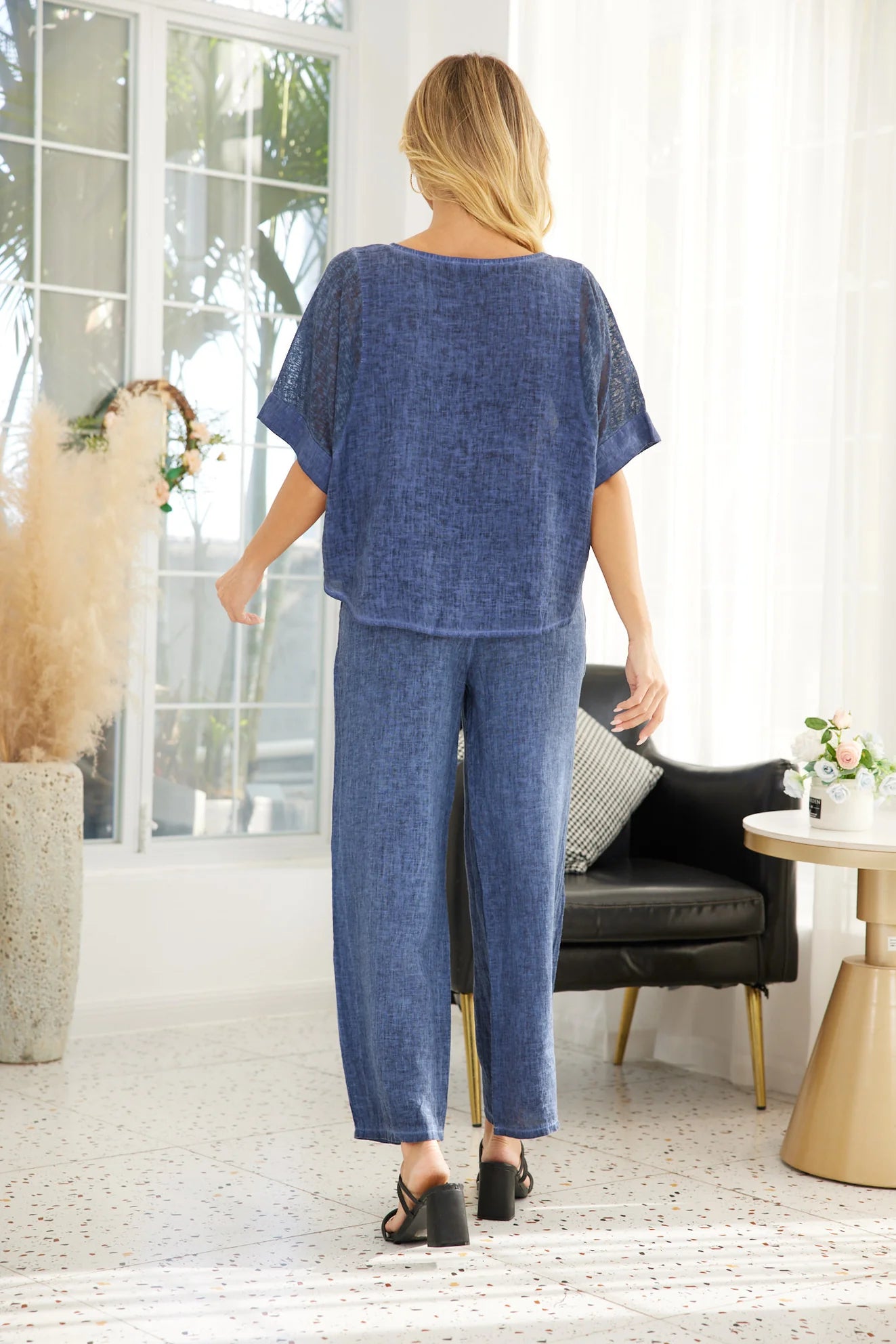 Cold Wash Linen & Cotton Knit Sleeve Round Top in Navy